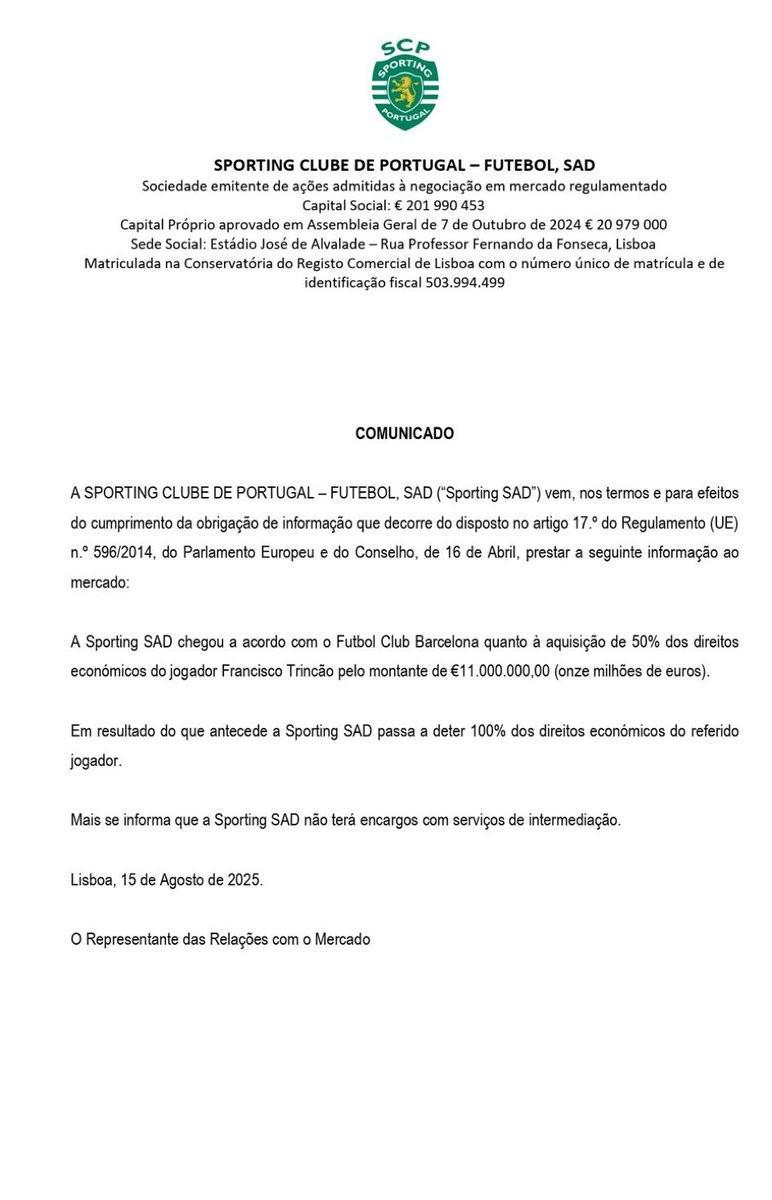 葡萄牙体育足球俱乐部股份公司通过官方公告透露,俱乐部已与巴塞罗那俱乐部就收购球员特林康50%的经济权益达成协议,交易金额为1100万欧元。
